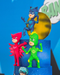 Considerado o rei da festa, incorporou-se perfeitamente na temática, com os três Pyjamasques 🦹🏻🦸🦸🏼♀️. O fundo da mesa com um plano da cidade a noite 🌃 é característico dos seus super-heróis, que só vestem a sua capa a meia-noite para aventuras incríveis. Para terminar da melhor forma, “Pow!”⚡️