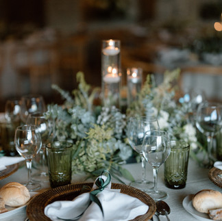 As flores, em tons suaves de branco e verde, estavam por toda a parte: no altar, nos centros de mesa. Combinadas com folhas frescas e ramagens de eucalipto, as flores criaram um ambiente de frescura e harmonia, que refletia perfeitamente o estilo de Teresa e Joel.
